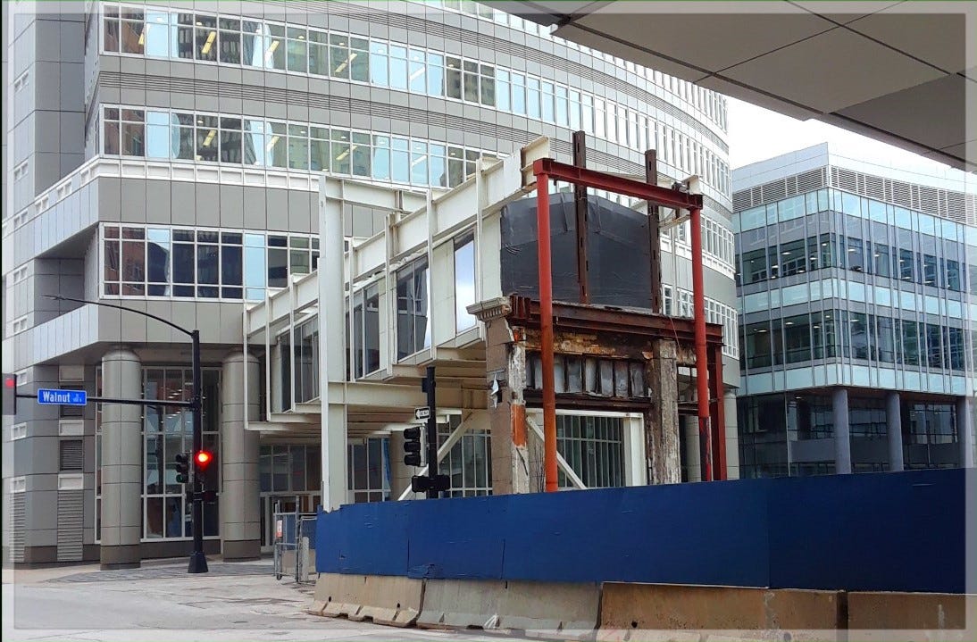The Iowa Chapter of the American Institute of Architects helped explain what’s left, which is visible from the streets, sidewalks and Skywalk at the corner of 7th and Walnut.