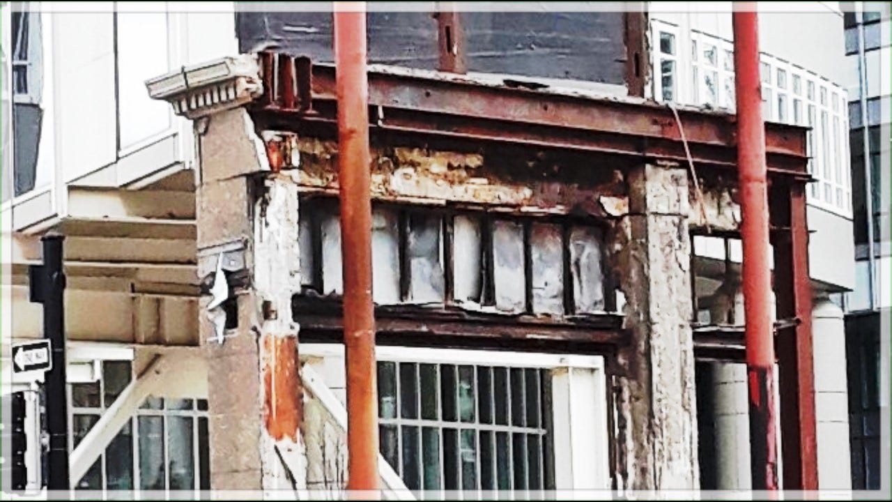 It’s a skeleton frame of stone, cast iron, plaster, and steel in downtown Des Moines. It’s what’s left of the Younkers building entry at 7th Avenue and Walnut. blocksdsm photo 04-21-2021